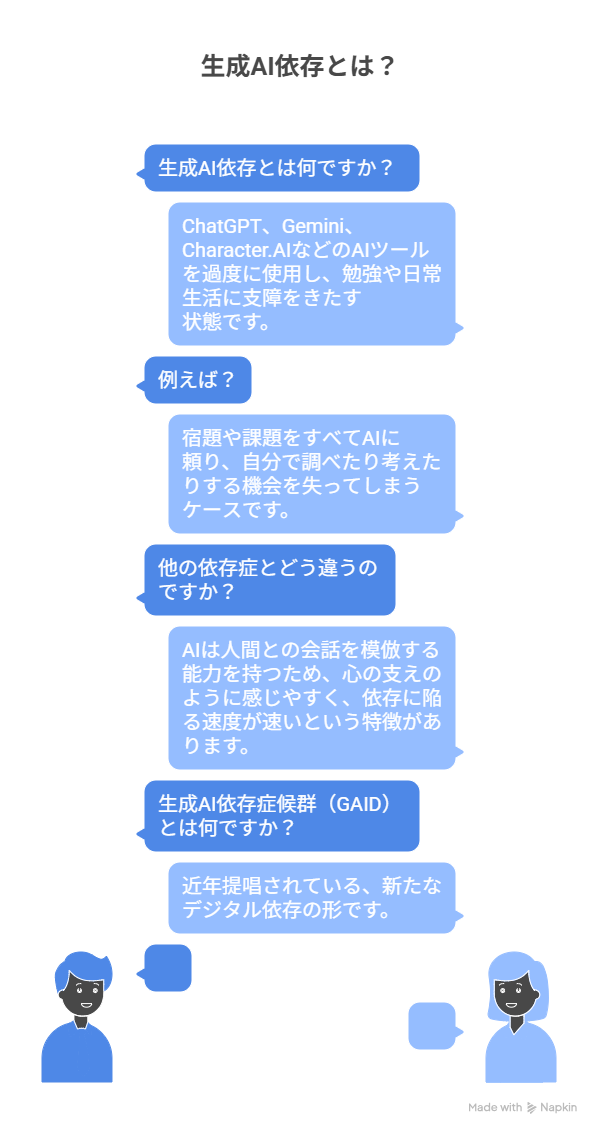生成AI依存とは、ChatGPT、Gemini、Character.AIといったAIツールを過度に使用し、勉強や日常生活に支障をきたす状態を指します。例えば、宿題や課題をすべてAIに頼り、自分で調べたり考えたりする機会を失ってしまうケースが該当します。これはインターネット依存やスマホ依存と類似していますが、AIが人間との会話を模倣する能力を持つため、心の支えのように感じやすく、依存に陥る速度が速いという特徴があります。近年では、「生成AI依存症候群(GAID)」という言葉も提唱され、新たなデジタル依存の形として注目されています。高校生の段階でこの問題を理解することは、将来の学習や生活において非常に重要です。
