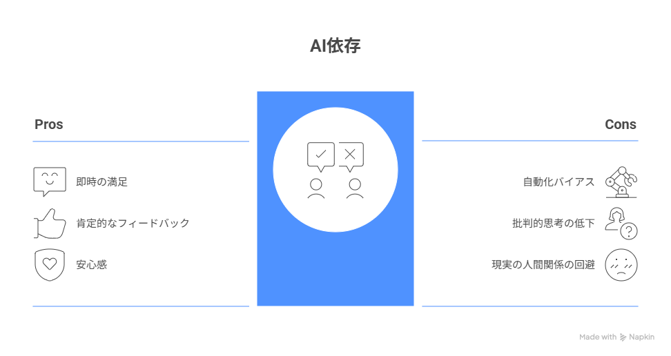 同時に、「AIの答えは正しい」と思い込みやすくなる自動化バイアスも働きます。その結果、批判的に判断する力が弱まり、自分で考える能力が低下する危険性があります。AIに励まされることで一時的に気分が楽になることもありますが、現実の人間関係を避けるようになると、依存につながる大きな要因となります。