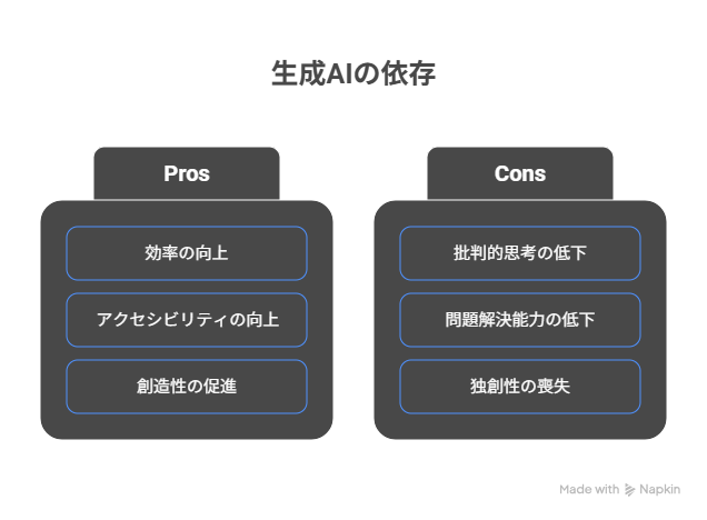 AIに過度に依存すると、「認知的オフロード」という現象が起こりやすくなります。これは、自分の頭で考える機会が減ることを意味します。