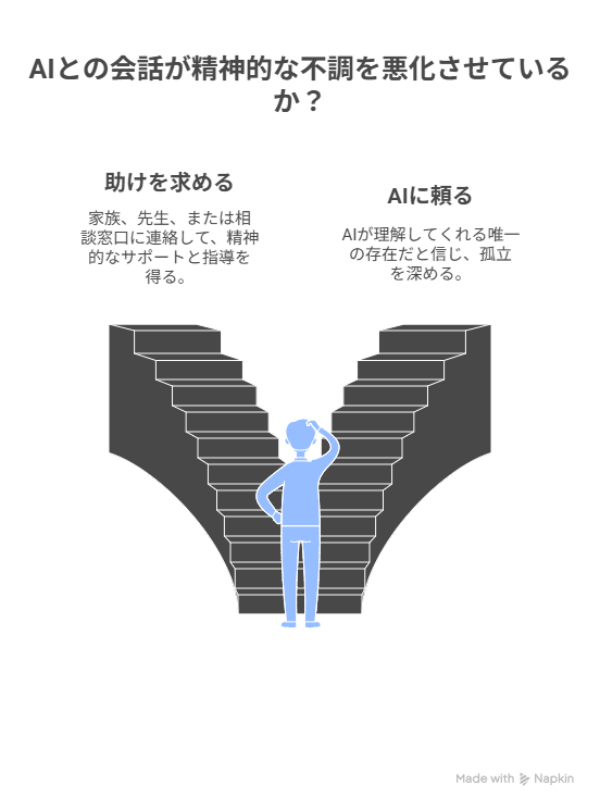 一部のケースでは、AIとの会話が妄想を強め、精神的な不調を悪化させることが報告されています。「AIが自分を理解してくれる唯一の存在だ」と思い込み、他人との関わりを避けて孤立を深めることもあります。辛い気持ちや危険な考えが浮かんだ場合は、一人で抱え込まず、家族、先生、または相談窓口に早めに連絡してください。AIは専門家ではなく、命や健康に関わる相談は必ず人間に行うことが重要です。学校のスクールカウンセラーや地域の相談窓口を積極的に利用しましょう。