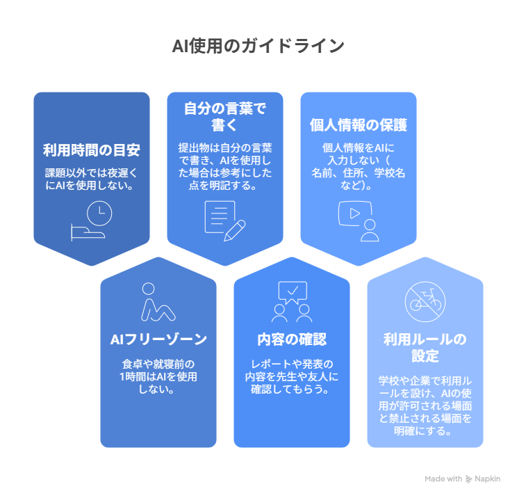 利用時間の目安を設定する(例:課題以外では夜遅くにAIを使用しない)。