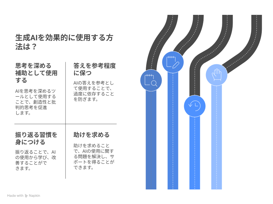 生成AI依存は誰にでも起こりうる問題ですが、正しい使い方を学べば強力な味方になります。重要なのは、AIを「代わりに考える道具」としてではなく、「思考を深める補助」として活用することです。まず自分で考え、AIの答えは参考程度に留めましょう。そして、「なぜうまくいったのか」「どこが間違っていたのか」を振り返る習慣を身につけることが大切です。