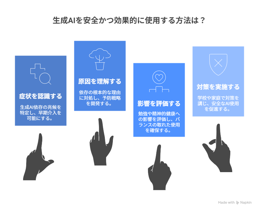 さらに、友人や家族との会話よりもAIとのやり取りを優先したり、AIの利用時間を隠したりする行動も見られます。これらの小さなサインの積み重ねが、学業成績や健康に悪影響を及ぼす可能性があります。