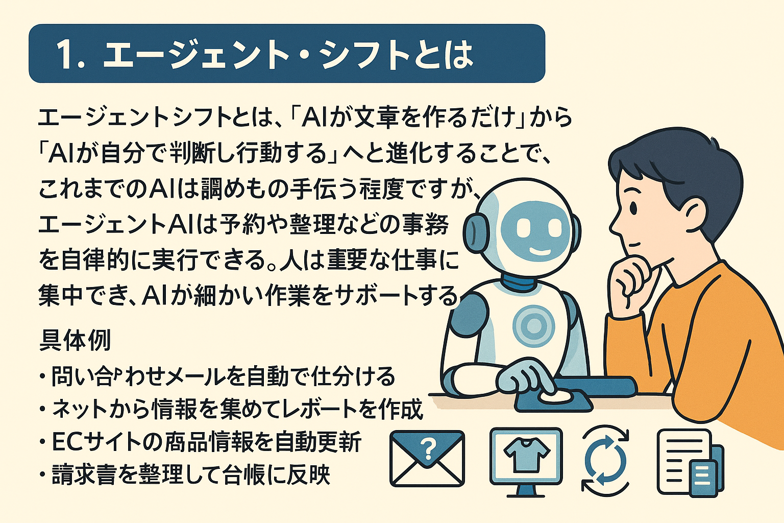エージェント・シフトとは、「AIが文章を作るだけ」から「AIが自分で判断し行動する」へと進化することです。これまでのAIは調べものを手伝う程度でしたが、エージェントAIは予約や整理などの作業を自律的に実行できます。人は重要な仕事に集中でき、AIが細かい作業をサポートする形です。
