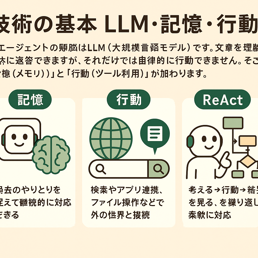 AIエージェントの頭脳はLLM(大規模言語モデル)です。文章を理解して自然に返答できますが、それだけでは自律的に行動できません。そこで「記憶(メモリ)」と「行動(ツール利用)」が加わります。