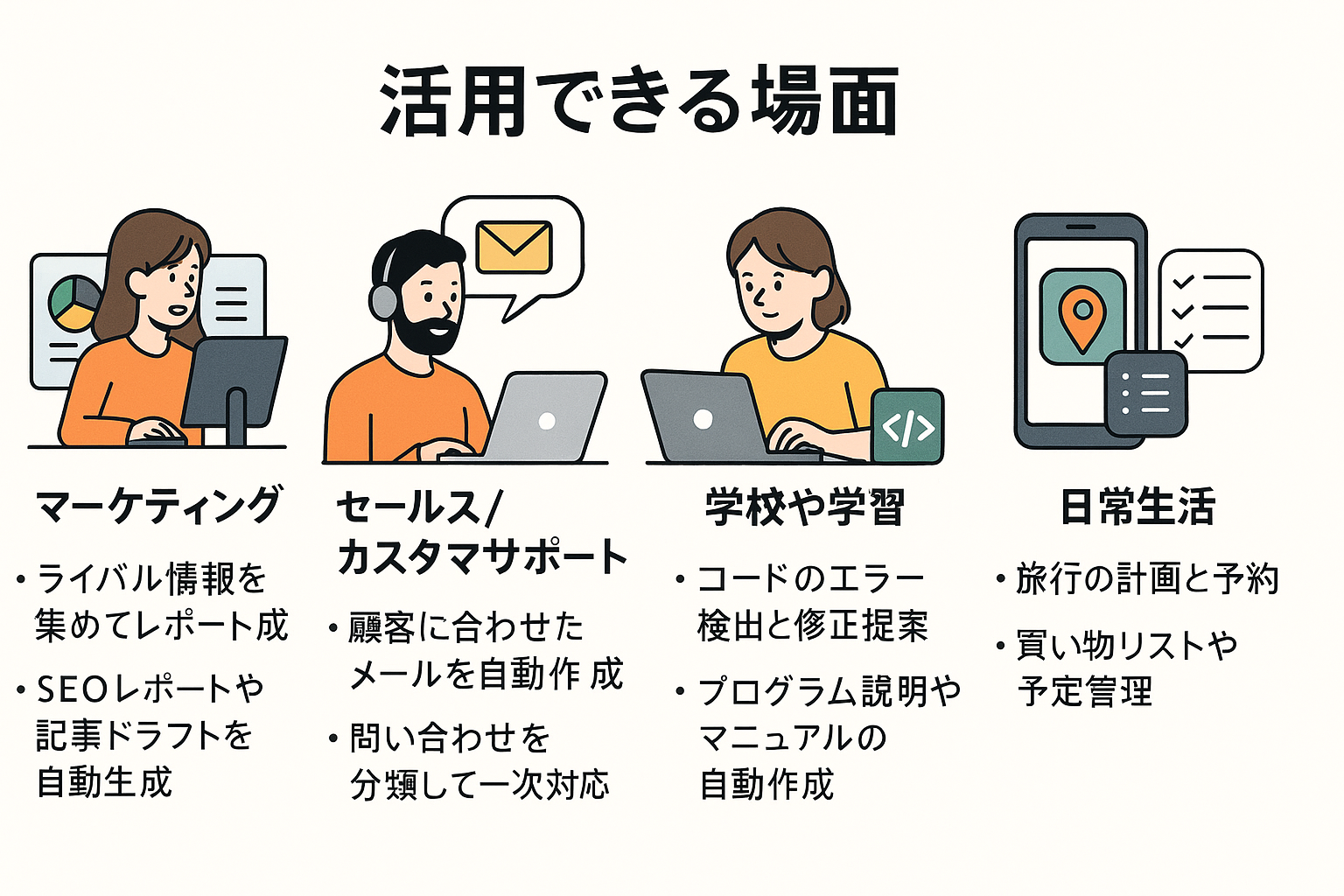 最初のChatGPTは会話中心のAIでした。しかしChatGPTエージェントは、複数のツールを駆使し、複雑なタスクも自律的に実行できます。たとえば「旅行を計画して予約」までを一度の指示で行います。
