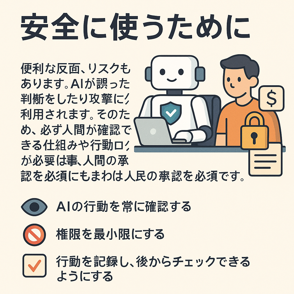 便利な反面、リスクもあります。AIが誤った判断をしたり攻撃に利用されたりする可能性があります。そのため、必ず人間が確認できる仕組みや行動ログの管理が大切です。特にお金や個人情報に関わる操作は、人間の承認を必須にすべきです。