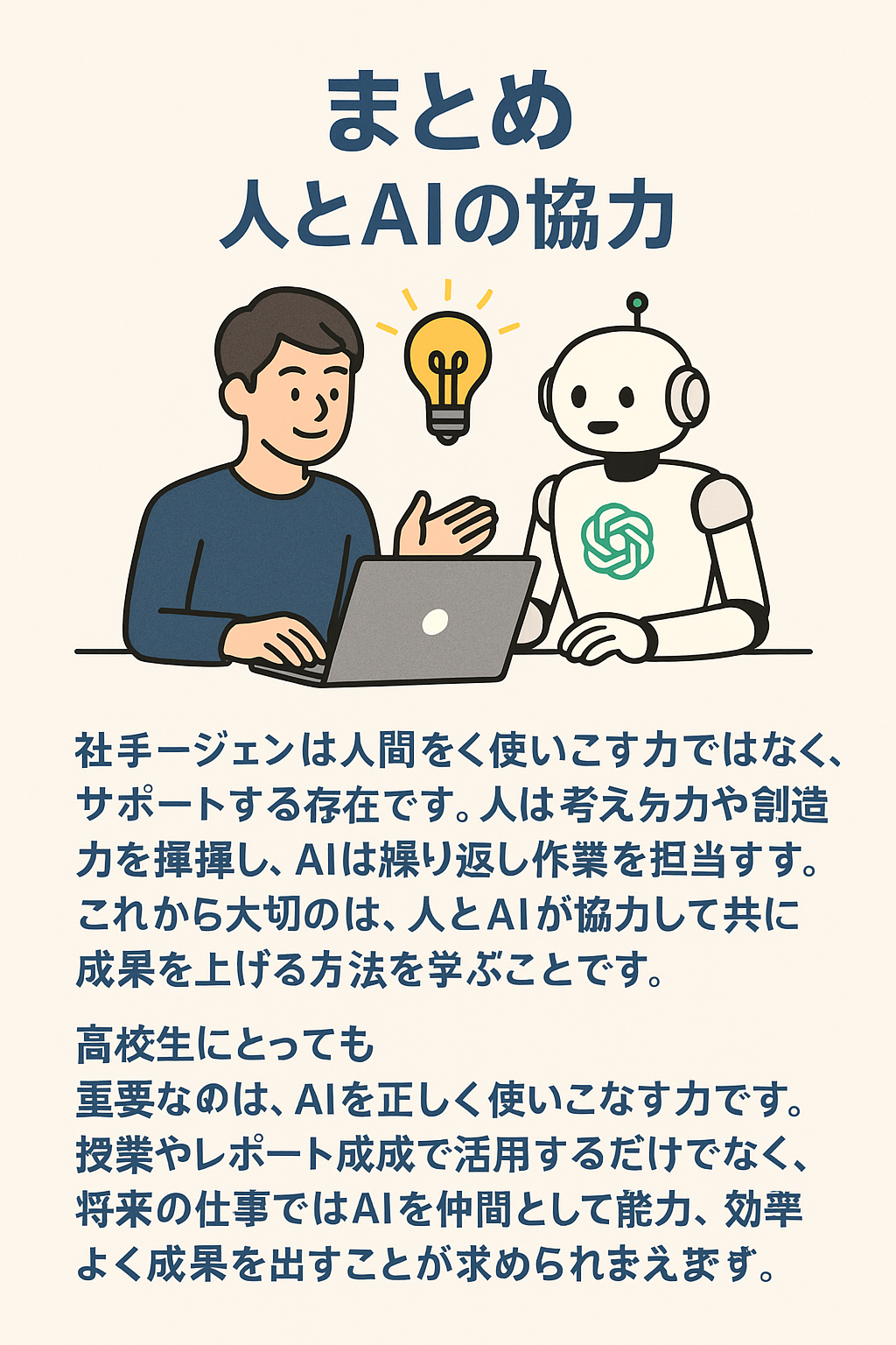 高校生にとっても重要なのは、AIを正しく使いこなす力です。授業やレポート作成で活用するだけでなく、将来の仕事ではAIを仲間として協力し、効率よく成果を出すことが求められます。AIの仕組みや限界を理解し、安心して活用できる力を早いうちに身につけておくことが、これからの社会で強みになります。