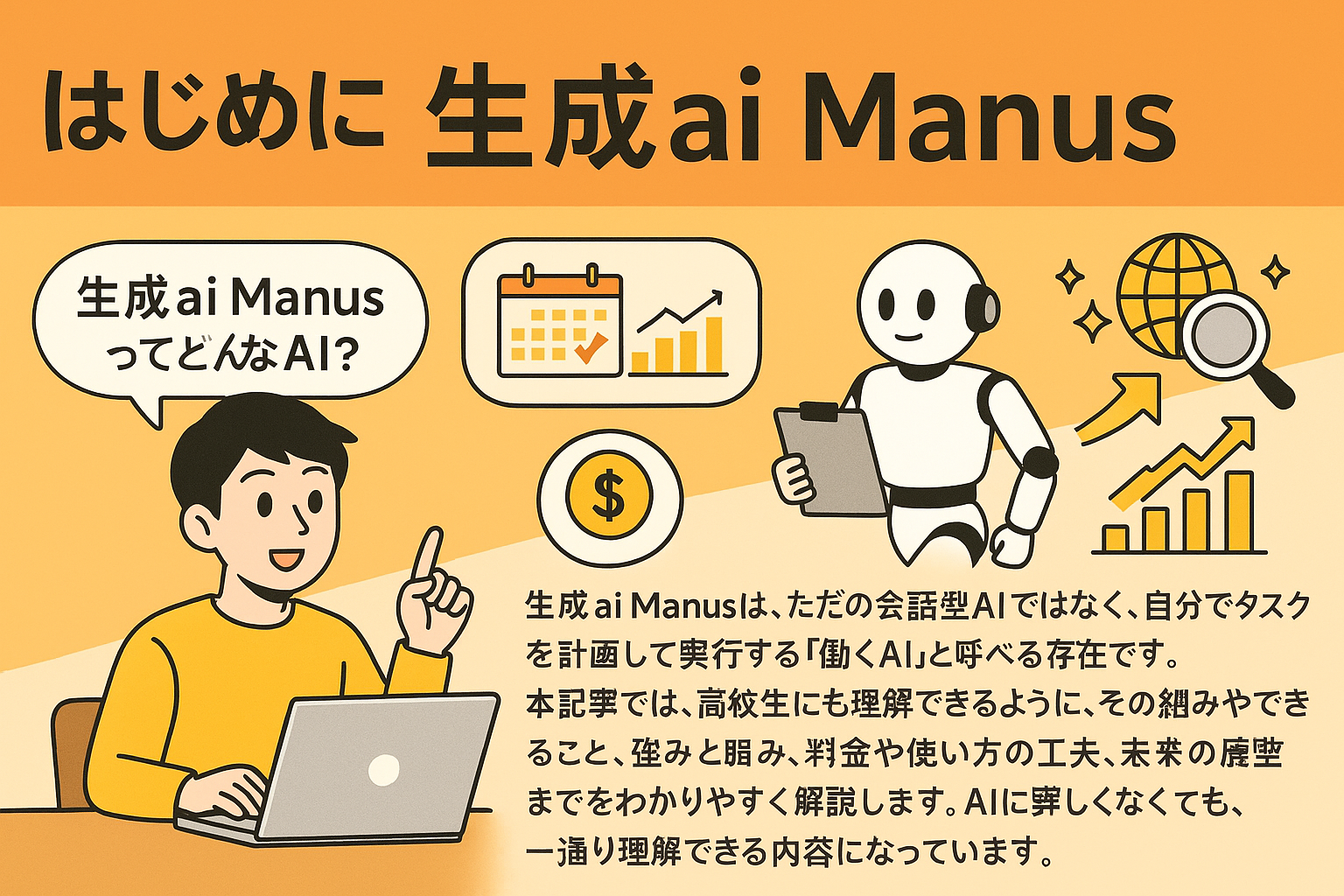 生成ai Manusは、ただの会話型AIではなく、自分でタスクを計画して実行する「働くAI」と呼べる存在です。本記事では、高校生にも理解できるように、その仕組みやできること、強みと弱み、料金や使い方の工夫、未来の展望までをわかりやすく解説します。AIに詳しくなくても、「生成ai ManusってどんなAI?」が一通り理解できる内容になっています。