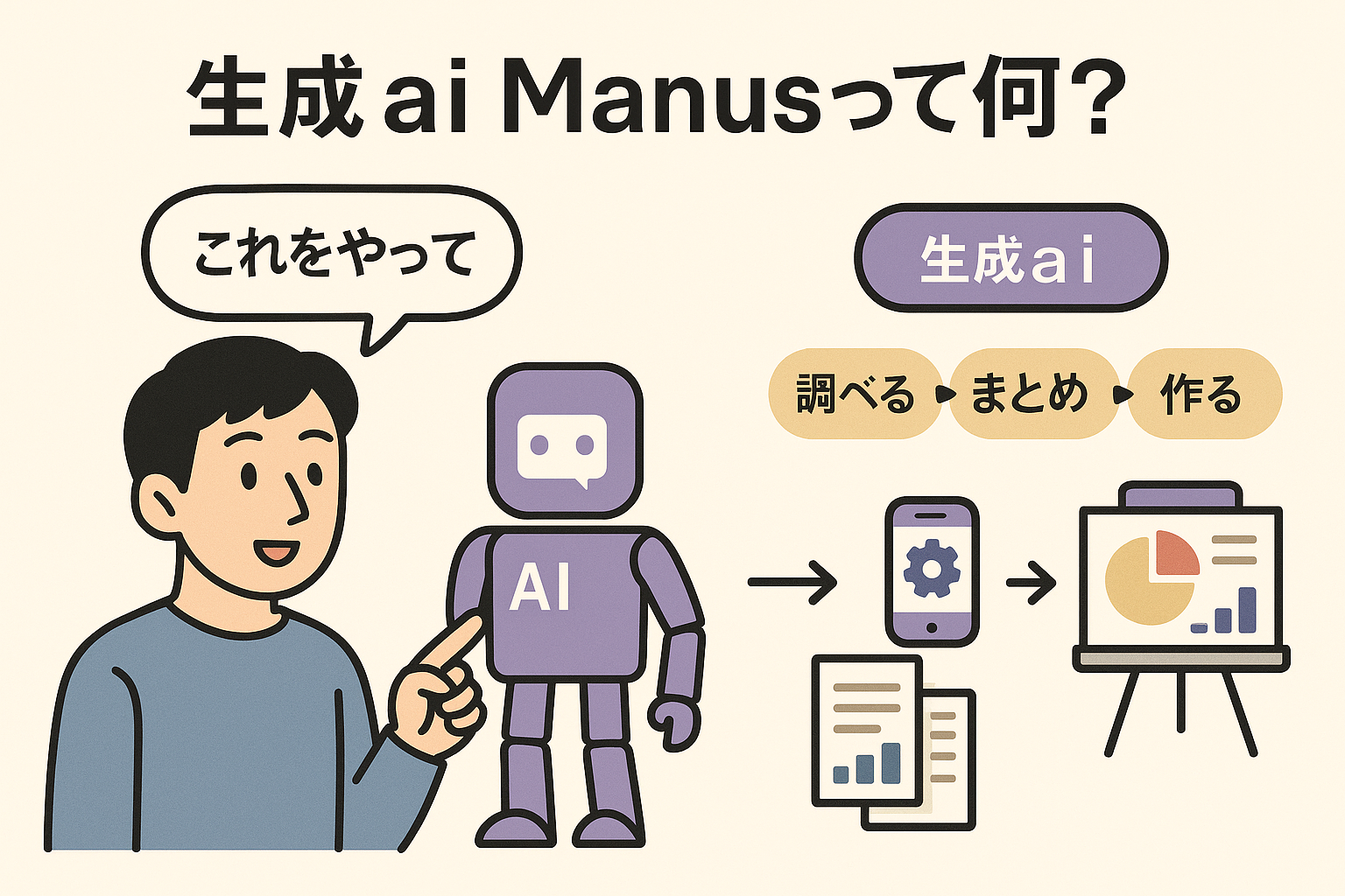 生成ai Manusは、人間が「これをやって」と指示すると、その指示を小さな作業に分け、順番を決めて進めていくAIです。普通のチャットAIは質問に答えたり文章を書いたりすることが中心ですが、Manusはさらに進んで「調べる」「まとめる」「作る」といった作業を実際にこなし、成果物を返します。例えば、調査内容をレポートにまとめたり、簡単なアプリを作ったり、プレゼン資料を完成させることが可能です。