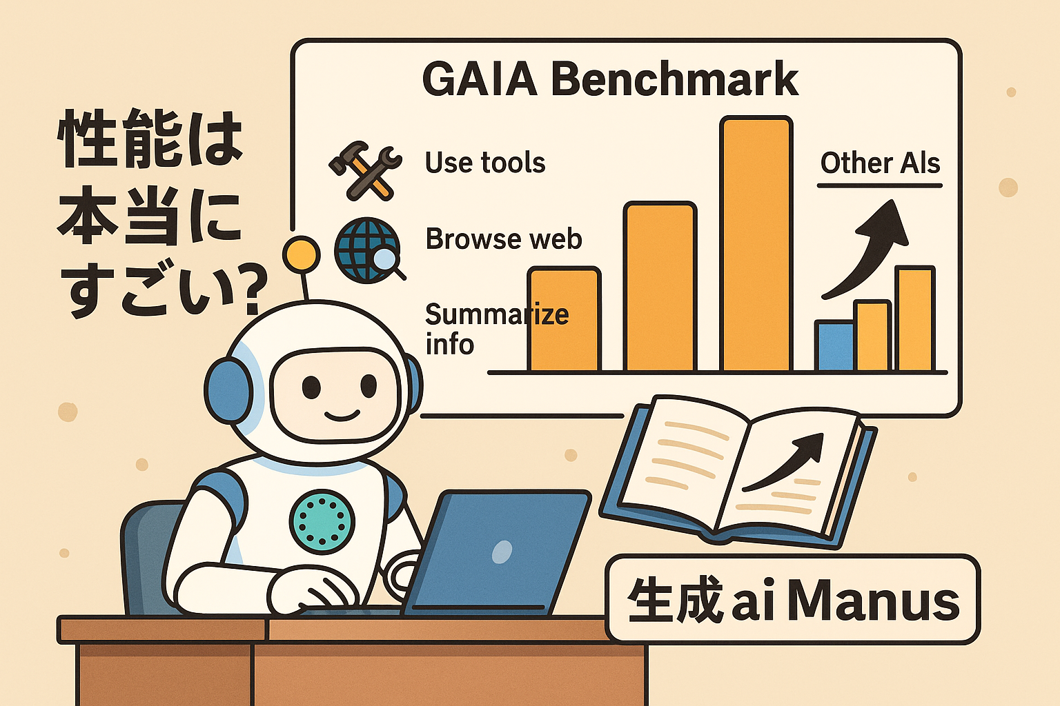 生成ai Manusは、AIの力を試す特別なテスト「GAIAベンチマーク」で高い成績を出しています。このテストは、単なる会話力ではなく「道具を使う力」「ウェブを調べる力」「情報をまとめる力」を測定します。その結果、Manusは特に難しいタスクで他のAIを大きく上回るスコアを出しました。これは単に文章を作るだけでなく、複雑な流れを最後までやり切る力を持っていることを示しています。