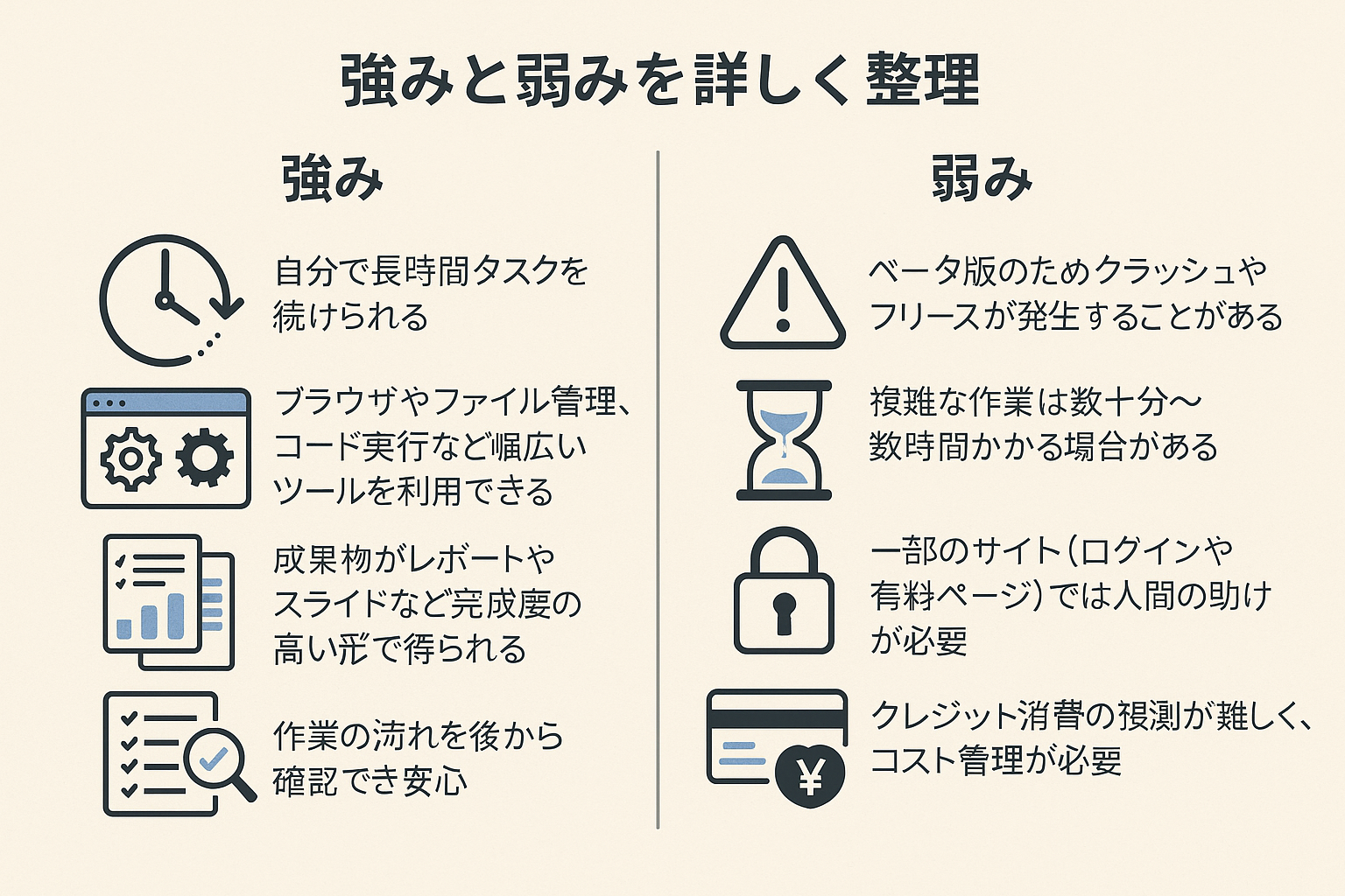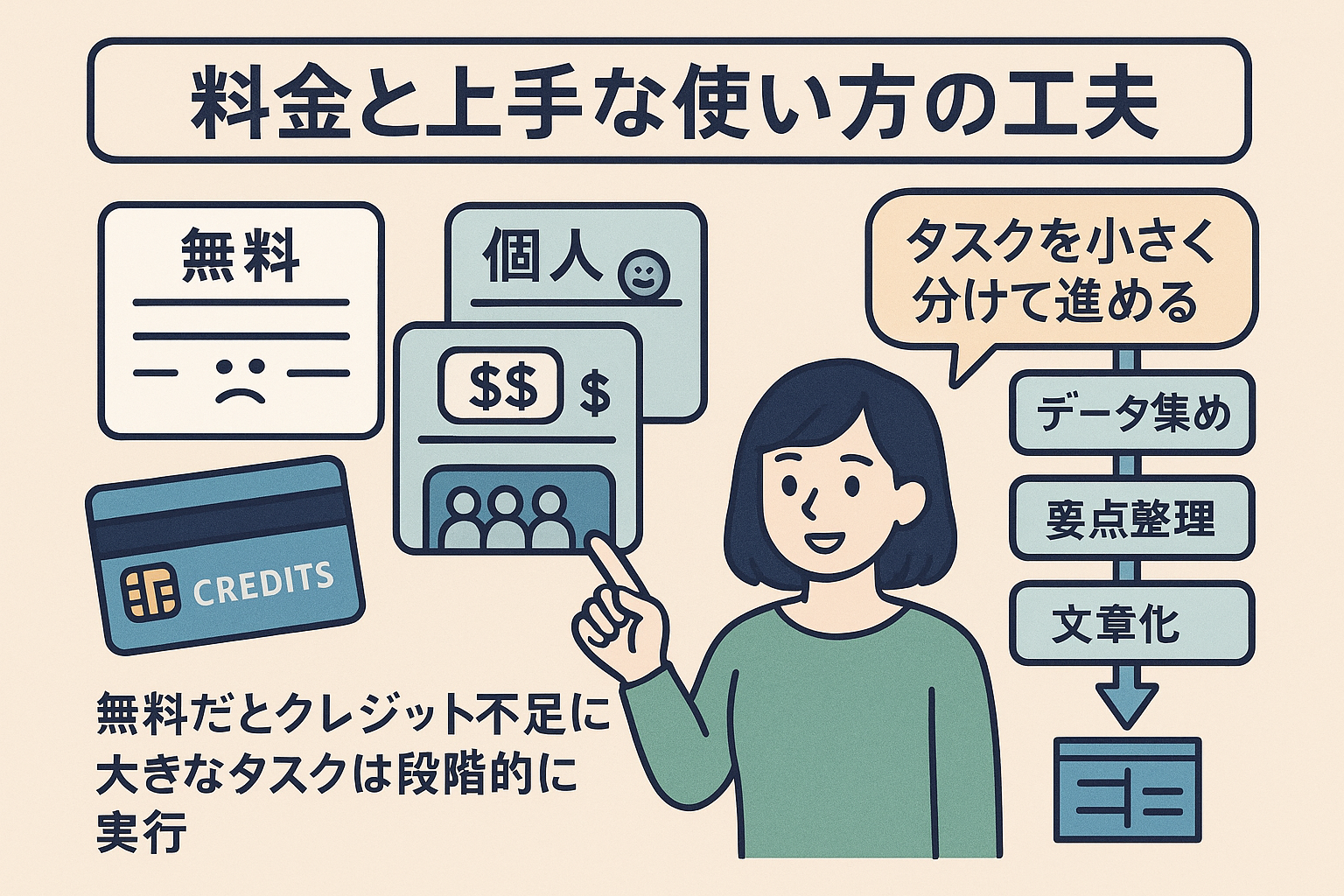 料金プランは個人からチームまで用意されており、月額制とクレジット制が組み合わされています。無料でも少しは使えますが、本格利用ではクレジット不足になりやすいです。効率的な使い方のコツは、大きなタスクを小さく分けて進めることです。例えば「レポート全体を一気に作らせる」のではなく、「データ集め→要点整理→文章化→図表追加」と段階的に実行させると、エラーが減り効率も向上します。