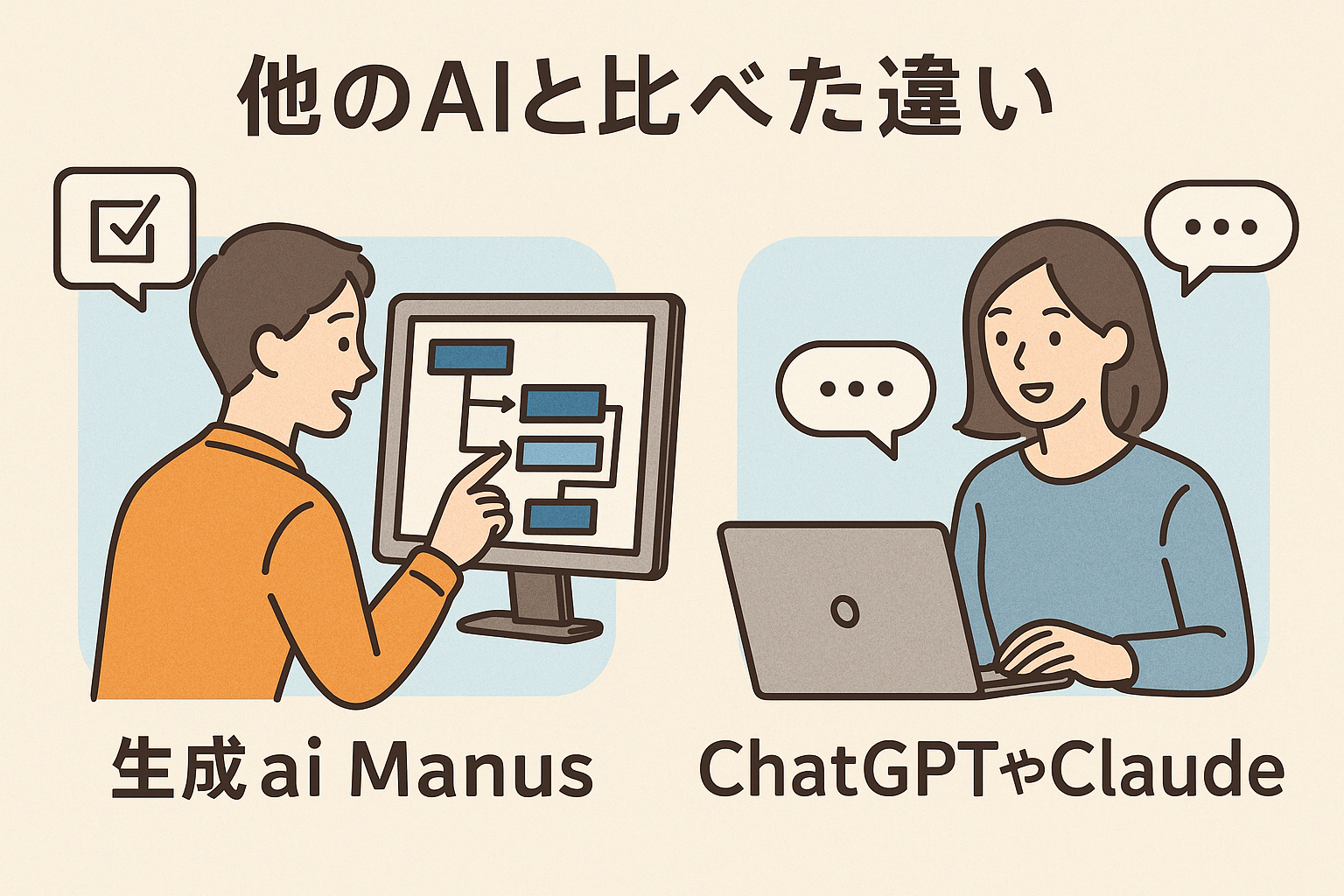 生成ai Manusは最初から「タスクをこなすAI」として設計されています。一方、ChatGPTやClaudeのような有名AIは会話型としてスタートし、後からタスク実行機能を追加しました。そのため、Manusは複雑なプロジェクトを丸ごと任せるのに強く、他のAIは短いやり取りや即時回答に強いという違いがあります。