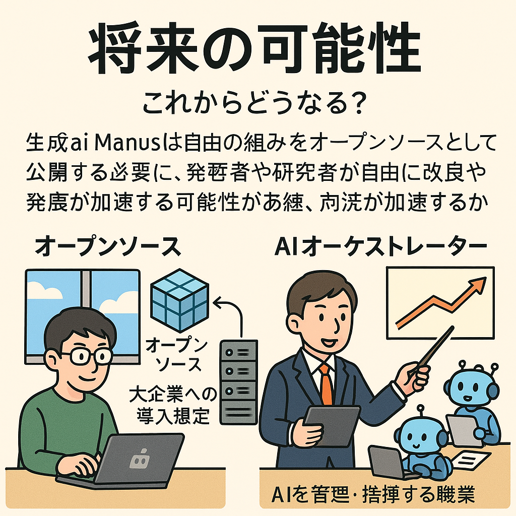 生成ai Manusは今後、一部の仕組みをオープンソースとして公開すると発表しています。これにより、開発者や研究者が自由に改良でき、発展が加速する可能性があります。また、企業向け機能も追加され、大企業が業務に導入する未来も想定されます。その中で、人がAIを管理・指揮する「AIオーケストレーター」という新しい職業が生まれるかもしれません。これはAIを効率的に動かすプロジェクトマネージャーのような役割で、将来のキャリアにも直結しそうです。