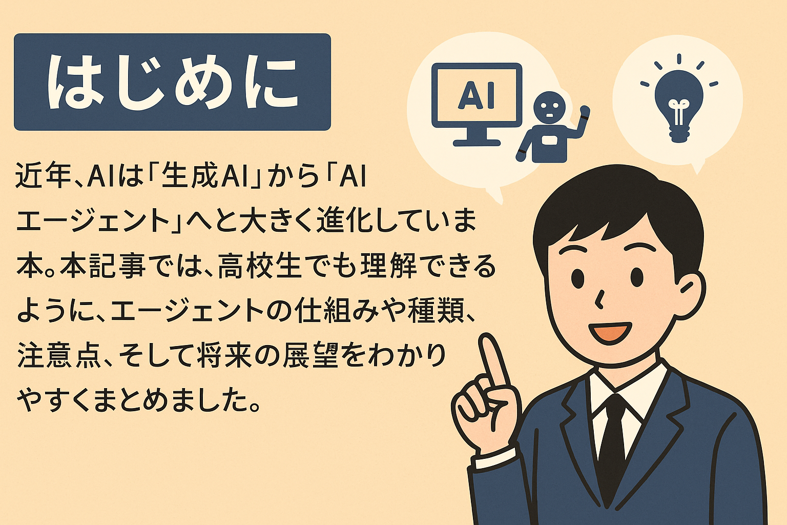 近年、AIは「生成AI」から「AIエージェント」へと大きく進化しています。本記事では、高校生でも理解できるように、エージェントの仕組みや種類、注意点、そして将来の展望をわかりやすくまとめました。