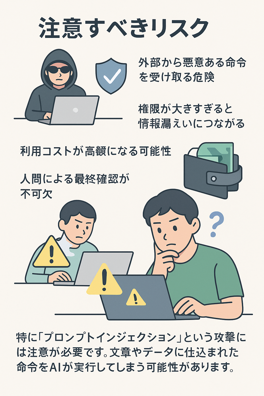 特に「プロンプトインジェクション」という攻撃には注意が必要です。文章やデータに仕込まれた命令をAIが実行してしまう可能性があります。