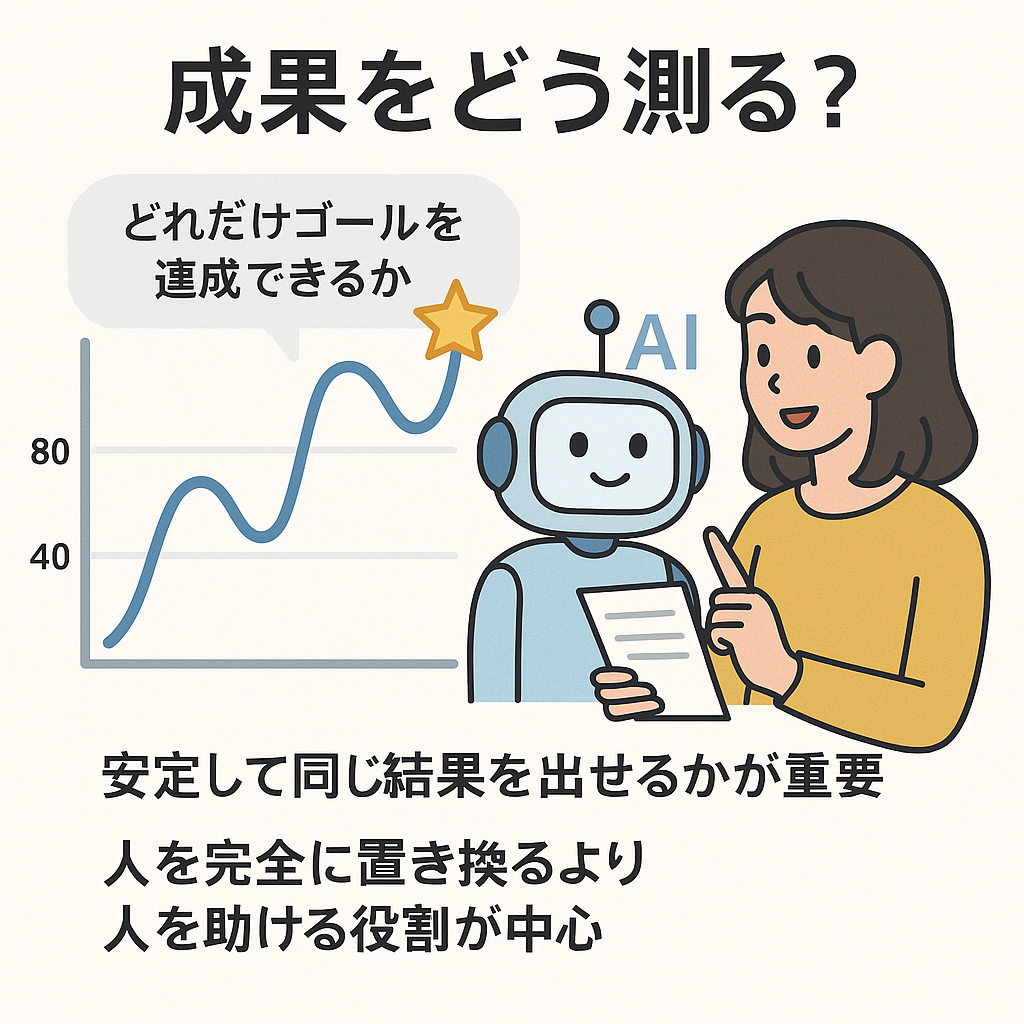 AIエージェントの力は「どれだけゴールを達成できるか」で測ります。実験では成功率が上がってきていますが、重要なのは「安定して同じ結果を出せるか」です。テストで80点を取っても次に40点なら安定していないのと同じです。現状では「人を完全に置き換える」より「人を助ける」役割が中心です。失敗しても下書きを作るだけで作業効率を大きく上げられます。