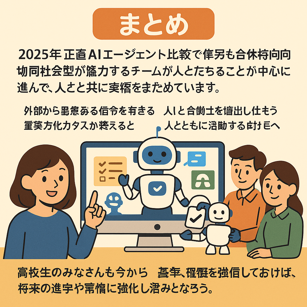 2025年の生成 ai エージェント 比較では、大企業向け統合型と専門特化型の両方が成長しています。現状では「人を置き換える」のではなく「人を助ける」ことが中心です。そして未来はAI同士が協力し、人と共に活動する時代へと進んでいきます。高校生のみなさんも今から基礎を理解しておけば、将来の進学や就職に大きな強みとなります。AIを正しく理解し、恐れず活用していきましょう。