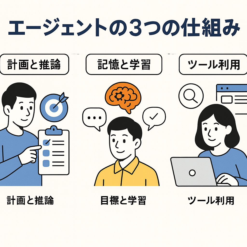 AIエージェントを支える基本的な仕組みは次の3つです。