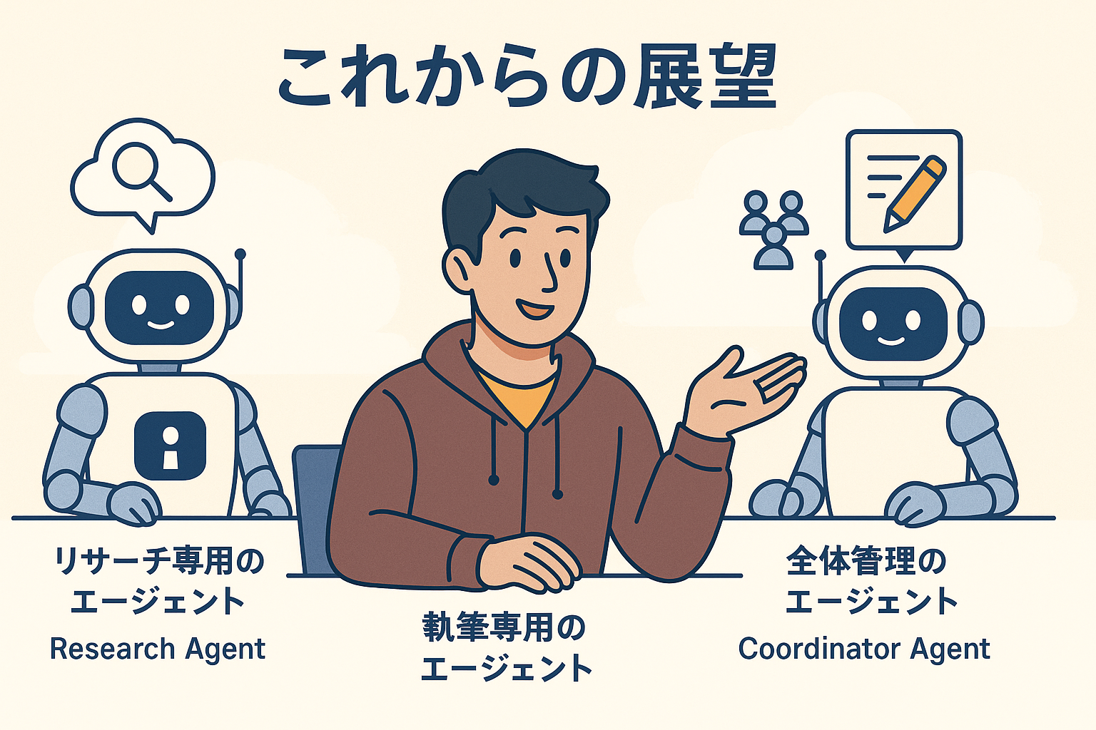 今後は「単独のエージェント」より「複数のエージェントが協力するチーム型」が増えると予測されています。調査専門のエージェント、文章をまとめるエージェント、全体を管理するエージェントが協力するのです。これは文化祭の実行委員会のように役割を分担して成功を目指すイメージです。AIの進化は、人と同じようにチームで働く方向に進んでいます。