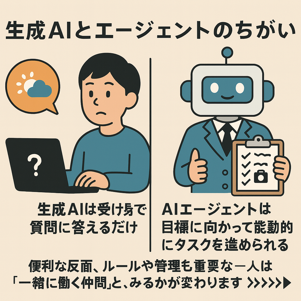 生成AIは「質問に答える」「文章や画像を作る」ことが得意ですが、人が指示しないと動きません。いわば受け身の存在です。一方、AIエージェントは生成AIを頭脳として利用し、自分で考え、計画し、行動できます。例えば「明日の天気を教えて」と聞くと生成AIは答えを返すだけですが、エージェントなら天気を調べ、旅行の持ち物リストまで準備してくれます。