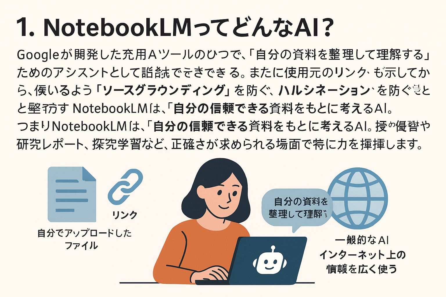 つまりNotebookLMは、「自分の信頼できる資料をもとに考えるAI」。授業の復習や研究レポート、探究学習など、正確さが求められる場面で特に力を発揮します。