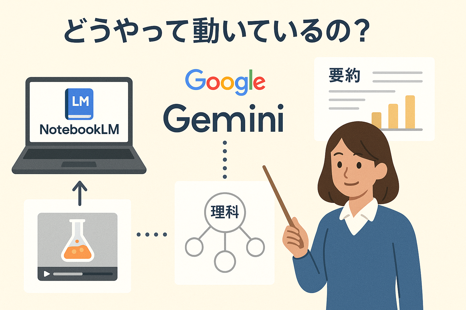NotebookLMの頭脳は、Googleの最新AIモデル「Gemini(ジェミニ)」です。Geminiはテキストだけでなく、画像・音声・動画などを同時に理解できる「マルチモーダルAI」。さらに、教育向けに調整された「LearnLM」を搭載しており、難しい内容もわかりやすく説明してくれます。