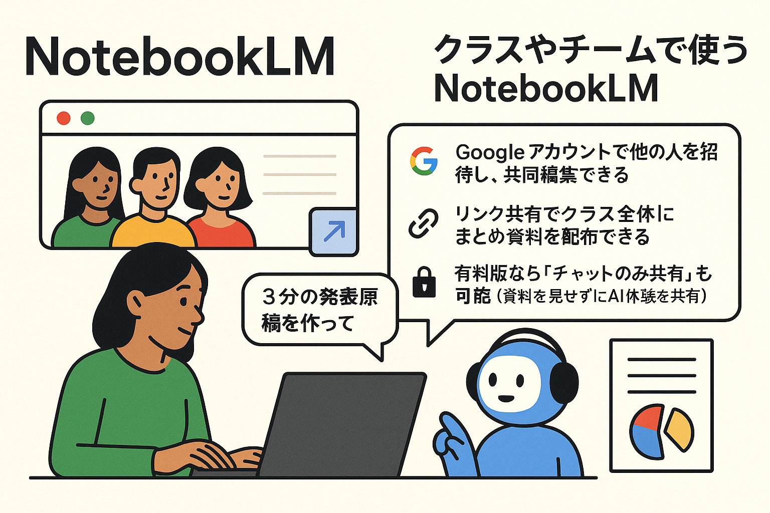 たとえば文化祭や探究発表の準備で、NotebookLMにチーム全員の資料をまとめて「3分の発表原稿を作って」と頼むと、短時間で統一感のあるスピーチ原稿が完成します。