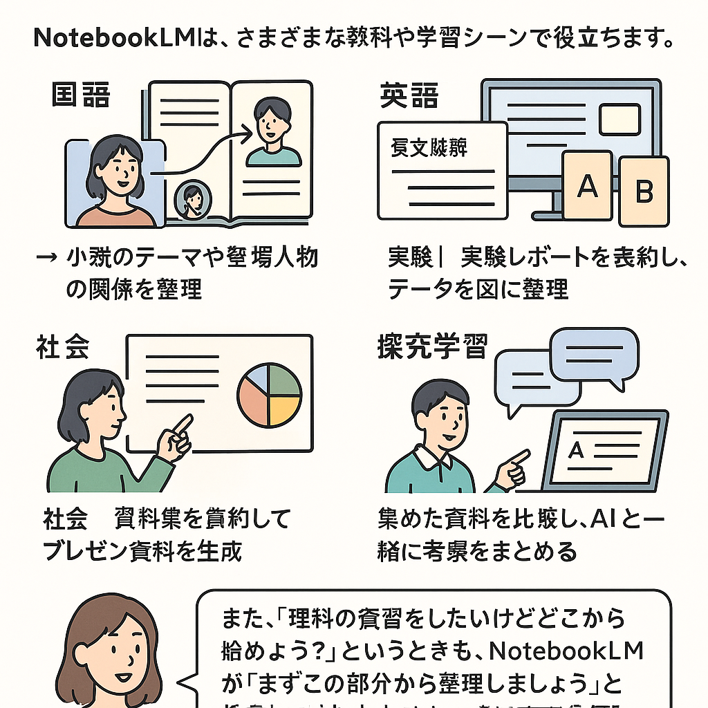 NotebookLMは、さまざまな教科や学習シーンで役立ちます。