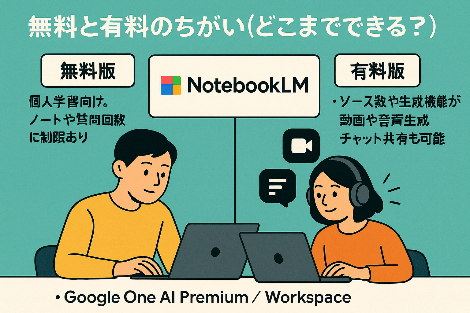 ・有料版(Google One AI Premium/Workspace)→ ソース数や生成機能が大幅に拡張。動画や音声生成、チャット共有も可能