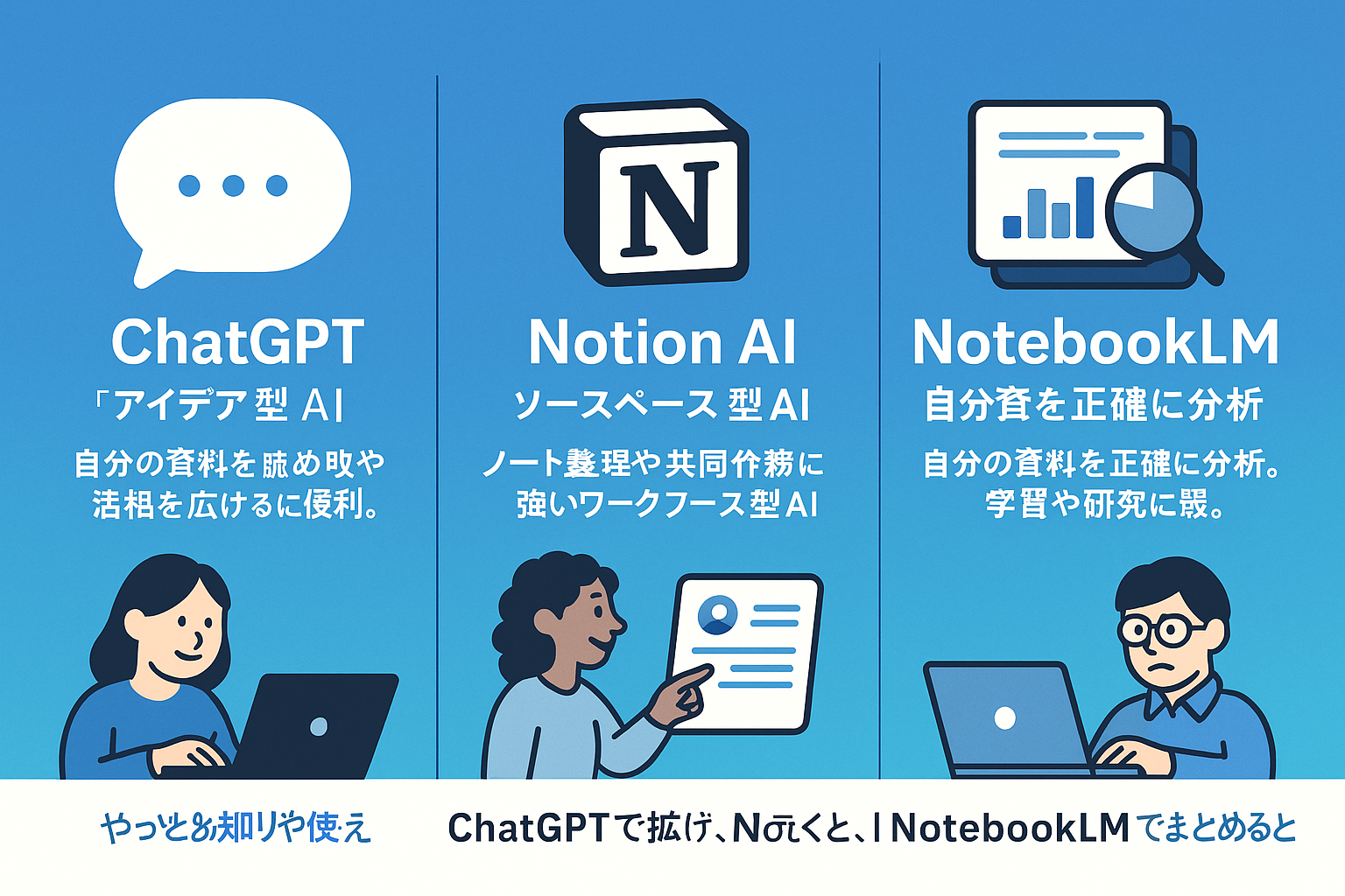 ChatGPTでアイデアを広げ、NotebookLMでまとめるといった併用もおすすめです。