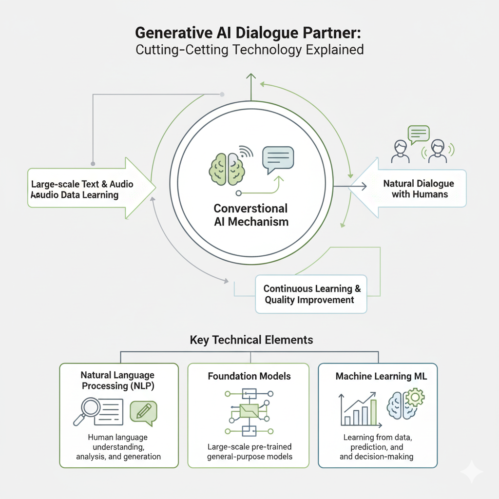 生成AI話し相手の基盤となる技術は、主に自然言語処理(NLP)、基盤モデル、そして機械学習(ML)の組み合わせによって成り立っています。これらの技術が連携することで、AIは人間のような自然な対話を実現しています。