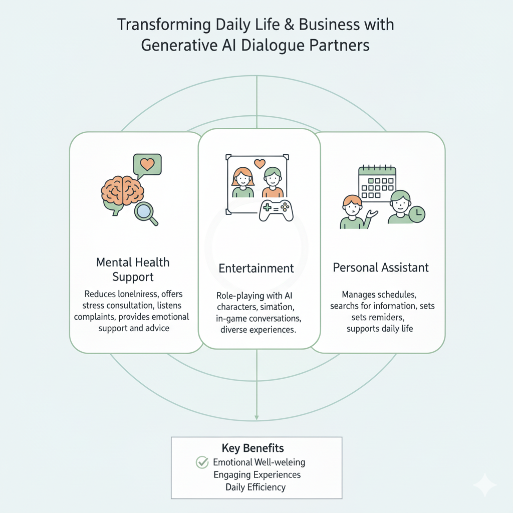 生成AI話し相手は、単なる雑談相手としてだけでなく、多岐にわたる分野で活用されています。主な活用事例を以下に示します。