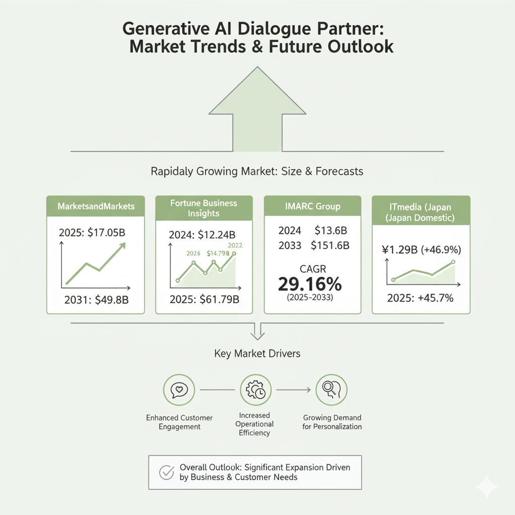 生成AI話し相手を含む会話型AI市場は、近年急速な成長を遂げており、今後もその拡大が予測されています。顧客エンゲージメントの強化、業務効率化のニーズの高まりが市場成長の主要な推進力となっています。