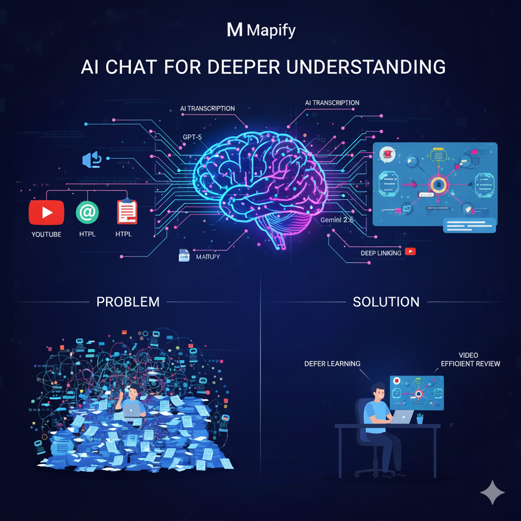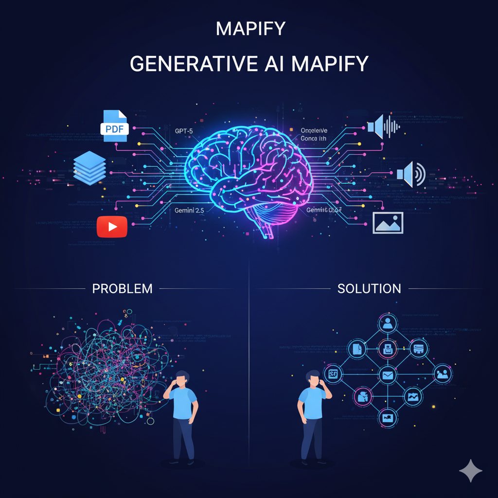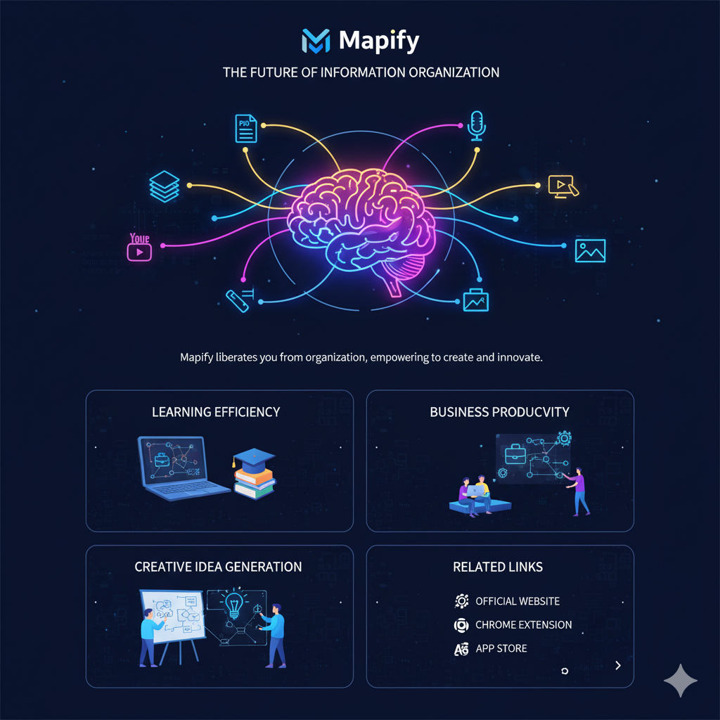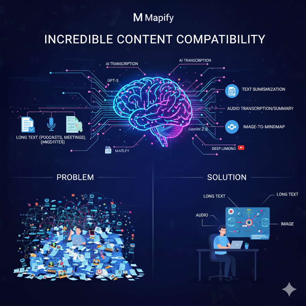 しかし、従来のマインドマップ作成には、情報の読み込み、要点の抽出、そして手動でのマッピングという手間と時間がかかる作業が必要でした。この課題を解決するために登場したのが、生成 ai Mapifyです。Mapifyは、最先端の生成AI技術(GPT-5やGemini 2.5などのLLM)を活用し、あらゆる形式のコンテンツを瞬時に、そして自動で構造化されたマインドマップに変換する革新的なツールなのです。これにより、私たちは情報整理にかける時間を大幅に短縮し、より本質的な思考や創造的な活動に集中できるようになります。