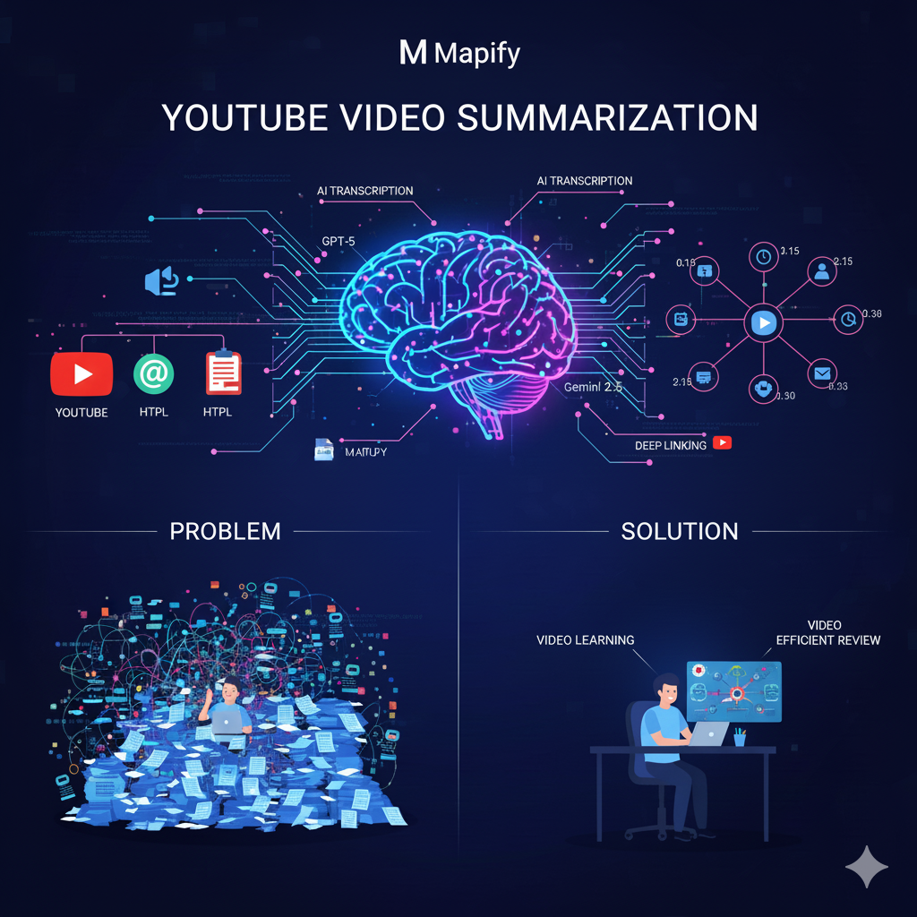 YouTube動画のURLを貼り付けると、Mapifyは動画の内容を自動で文字起こしし、その文字起こしデータから要点を抽出してマインドマップを作成します。さらに、マインドマップの各ノードには、動画内の該当箇所へジャンプできるタイムスタンプが連携されています。これは、動画学習やウェビナーの復習において、非常に強力な機能です。