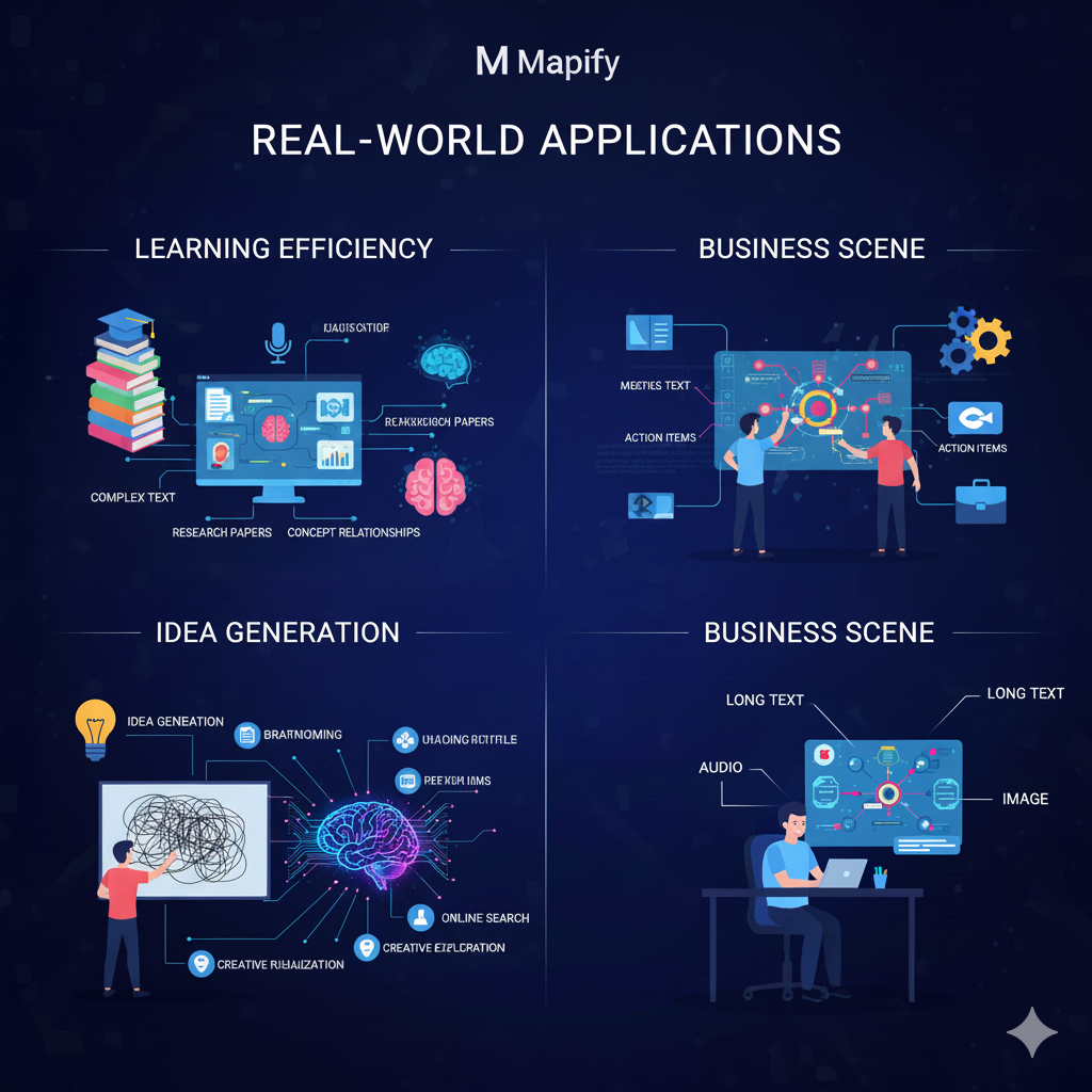 Mapifyは、個人の学習からビジネスの現場まで、幅広いシーンで活用できます。具体的な活用事例を通じて、その効果を実感してください。